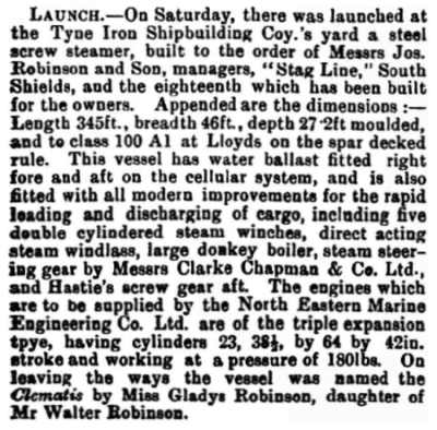 | 07/1898 | Stag Line Ltd (J Robinson & Sons), North Shields |