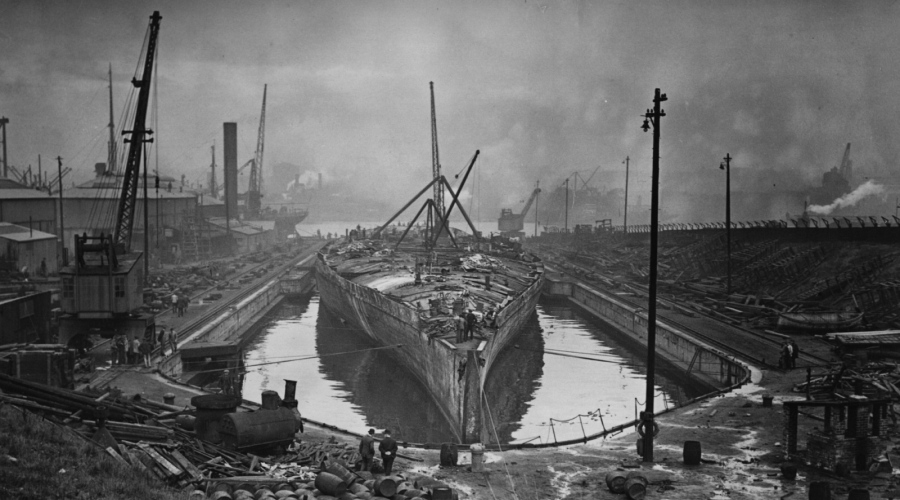 Initially, the pair started business in Hughes' existing Wharfage site in Derwenthaugh on Tyne. This is above the Newcastle bridges, so it could be quite restrictive when bringing ships in for scrapping. Their first scrapping was a Norwegian cargo ship NORFOLK which ran aground on the Black Middens at the mouth of the Tyne in January 1908. They could not have made any money, because between weather delays and such it took until 1914 to finish this 1813 gross ship. Their first warship was a battleship of 9,500 tons, HMS COLLINGWOOD (launched 1882). She was towed up to Dunston buoys and partly dismantled to lower her draft sufficiently to tow her alongside at Derwenthaugh. The next warship was another battleship of 10,500 tons, HMS BARFLEUR. On arrival in the Tyne in 1910, she became wedged between the sides of the Tyne swing bridge. She had run aground and refused to budge. After that uproar was settled, Hughes approached the Tyne Improvement Commission for a deeper water site further downstream, but this was rejected. On 11/11/1911 Hughes Bolckow signed leases for a new shipbreaking site with deeper water at Cambois, North Blyth. The German battleship NASSAU (20,000 tons, launched 1908) was brought to Derwenthaugh in 1920, stripped and then sold on to Holland in 1922. In February 1924 Hughes Bolckow secured the contract to break up the battleship HMS LION, however three weeks later Blyth Harbour Commissioners deemed she was too large to enter the harbour. She was also too large to be taken to the Derwenthaugh site. The contract was too valuable to lose so in April 1924 she was taken from Rosyth to the Tyne and berthed at Jarrow Slake where some of her topsides were removed. In November she was taken to Palmer's large drydock where Palmer's cut her in half and the after part was towed to Blyth for final breaking up and the fore part to Derwenthaugh. |