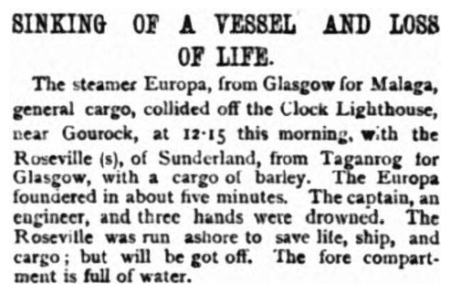 | 11/10/1884: Sank after a collision with ROSEVILLE in the Firth of Clyde | |