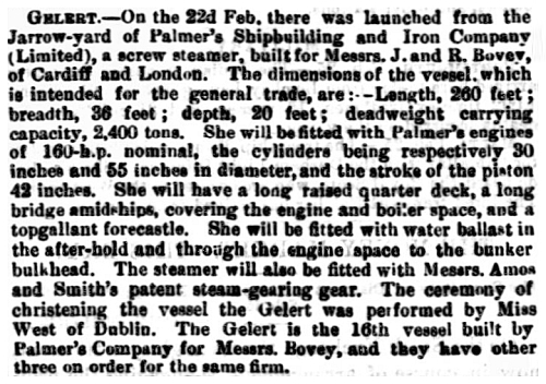 | 28/03/1883 | Gelert Steam Ship Co Ltd, Cardiff |