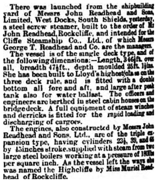 | 22/09/1909 | Cliffe Steamship Co Ltd (GT Readhead & Co), South Shields |