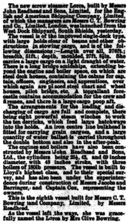 | Engines by: | John Readhead & Sons Ltd, South Shields |