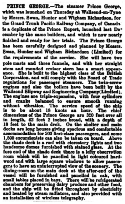 | 1930 | Prince George Ltd (Canadian National Steamships Ltd), Prince Rupert BC |