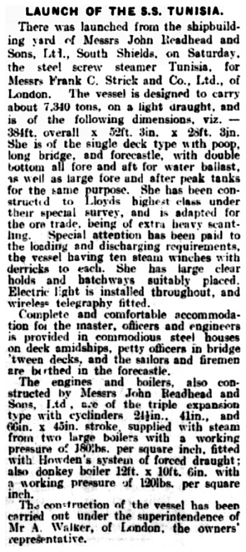 02/06/1927 | La Tunisien Steam Navigation Co Ltd (FC Strick & Co Ltd, managers), Swansea |